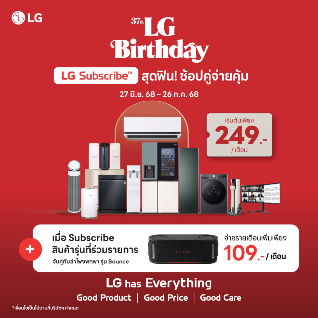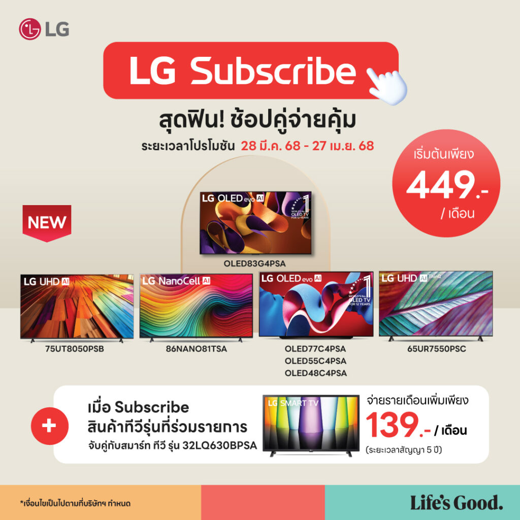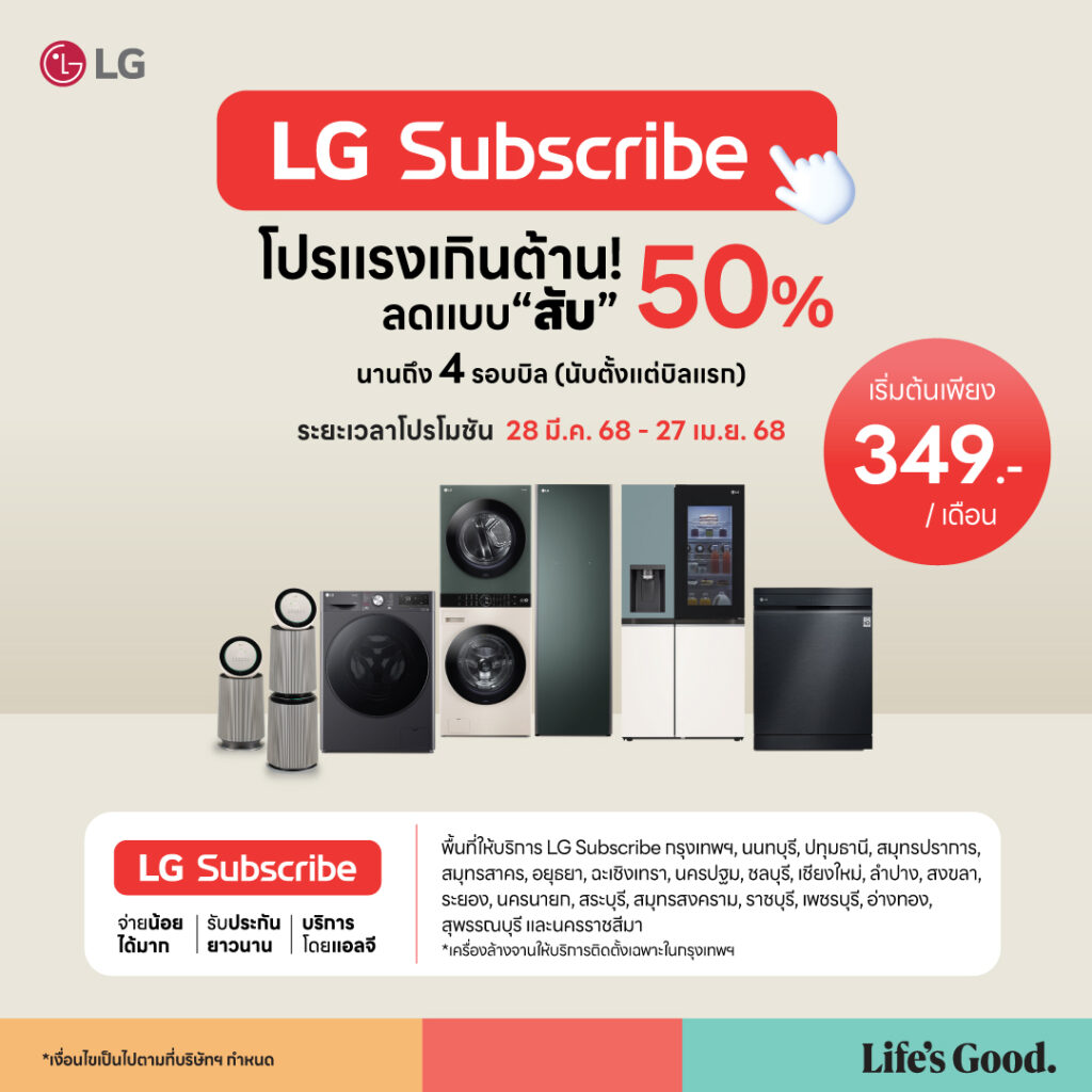LG Subscribe ให้ลูกค้าเป็นเจ้าของเครื่องใช้ไฟฟ้าได้ง่าย โดยชำระเริ่มต้นหลักร้อย/เดือน ทำให้เราไม่ต้องใช้เงินก้อนและยังได้รับประกันสินค้ายาวนานขึ้น ตลอดอายุสัญญา แถมสินค้าบางรายการได้รับการดูแลบำรุงรักษาจากทีม LG โดยตรง ทำให้เราไม่ต้องกังวลกับการดูแลเครื่องใช้ไฟฟ้า และเหมาะกับสภาพเศรษฐกิจปัจจุบันด้วยค่ะ