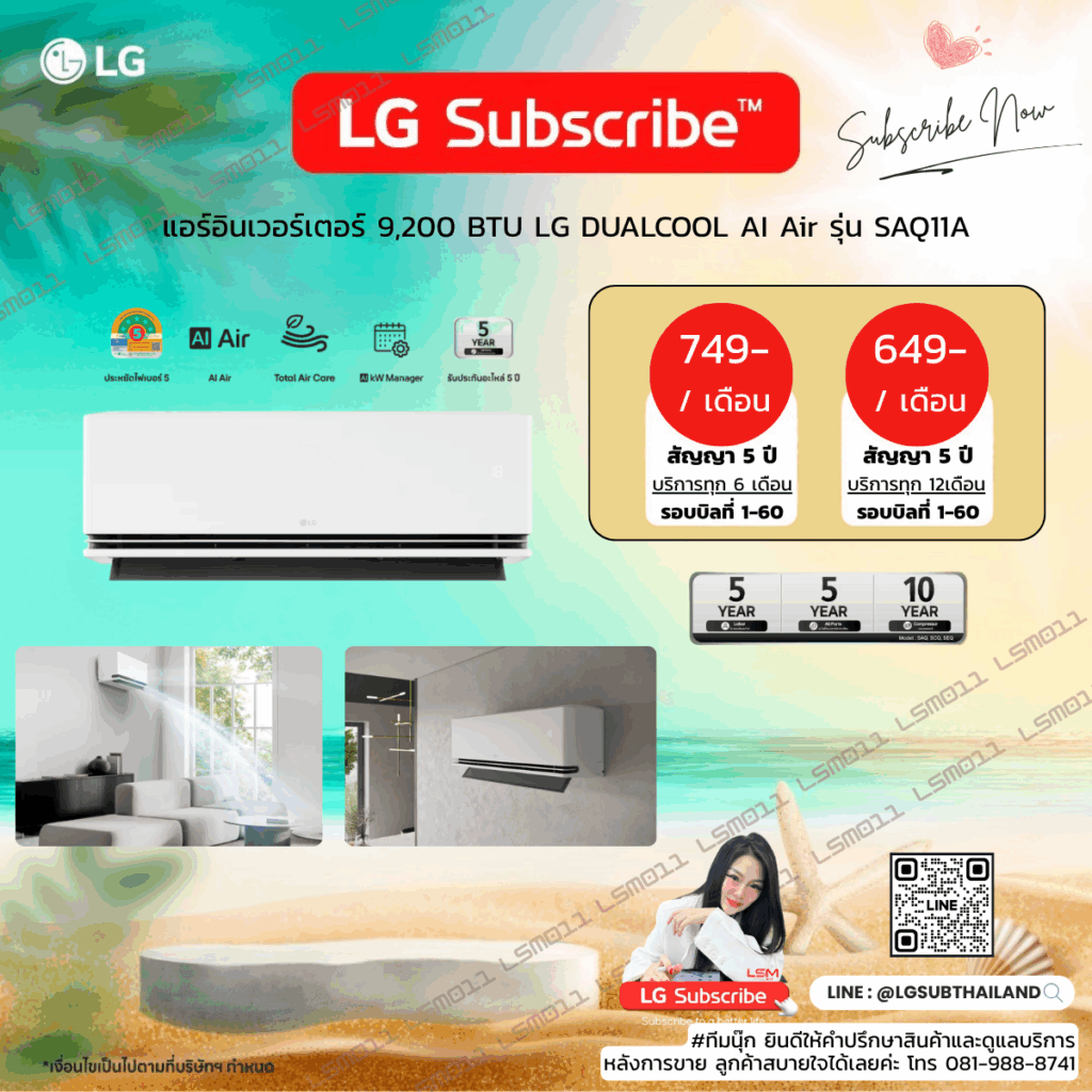แอร์อินเวอร์เตอร์ 9,200 BTU LG DUALCOOL AI Air รุ่น SAQ11A